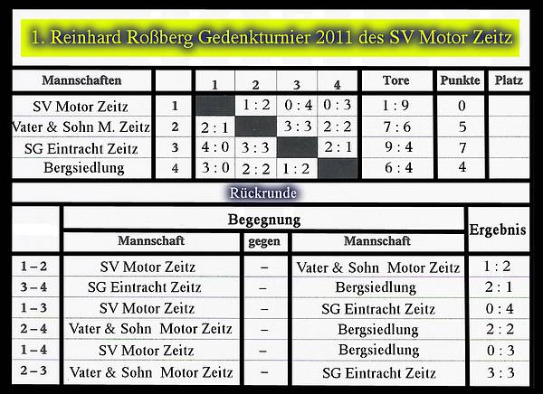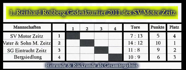 Am 12.06.2011 fand das 1. Reinhard Roßberg Gedenkturnier statt. Wie wir vom Veranstalter erfuhren, soll dieses Turnier zum Traditionsturnier werden. Das Turnier wurde in einer Doppelrund (Hin.-u.Rückrunde) gespielt. Die Mannschaft Vater & Sohn des SV Motor Zeitz konnte das Turnier mit 10 Punkten vor unserer Mannschaft die 9 Punkte erreichte gewinnen.