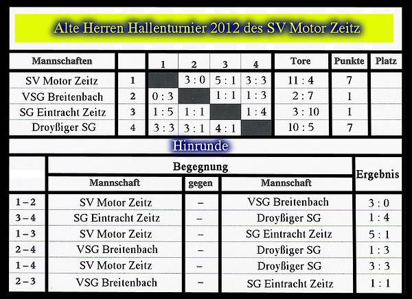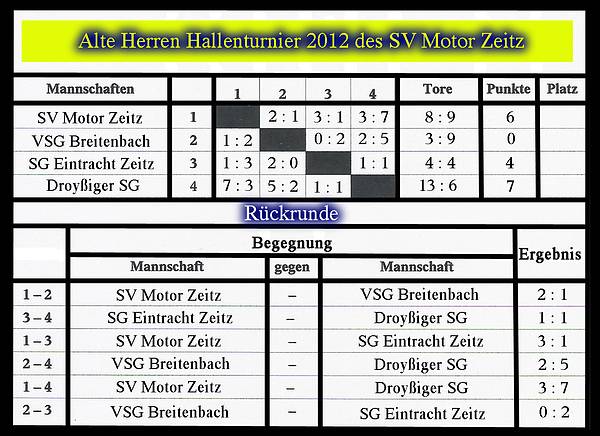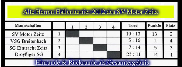 Am 11.02.2012 fand das Hallenturnier des SV Motor Zeitz in der Berufsschule Zeitz statt. Neben der Gastgebermannschaft waren die Droyßiger SG, SG Eintracht Zeitz und VSG Breitenbach zum sportlichen Wettkampf angetreten. Der Austragungsmodus lautete " jeder gegen jeden" in einer Doppelrunde. Droyßig und Motor waren nach der Hinrunde die Favoriten für den Gesamtsieg. Für unsere Mannschaft ging es darum die Breitenbacher hinter sich zu lassen. Mit jeweils 7 Punkten gingen Motor und Droyßig in die Rückrunde. Die Droyßiger SG konnte gegen Eintracht Zeitz in der Rückrunde nur ein 1:1 Unentschieden erreichen, so das die Mannschaft von Motor Zeitz bei einem Unentschieden gegen Droyßig das Turnier gewonnen hätte. Im entscheidenten Spiel drehte Droyßig gewaltig auf und schlug Motor Zeitz mit 7:3 Toren. Nun noch ein Hinweis in eigener Sache, der Torhüter der Breitenbacher Verletzte sich und mußte daher das Turnier beenden. Reiner Deutrich aus den Reihen der Eintracht stand die restlichen Spiele der Breitenbacher im Tor.